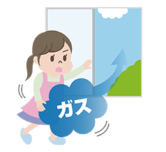 窓や扉を大きく開け風通しを良くしてガスを外に追い出してください。この時に換気扇などはスイッチを押すと火花が飛ぶため使用しないでください。